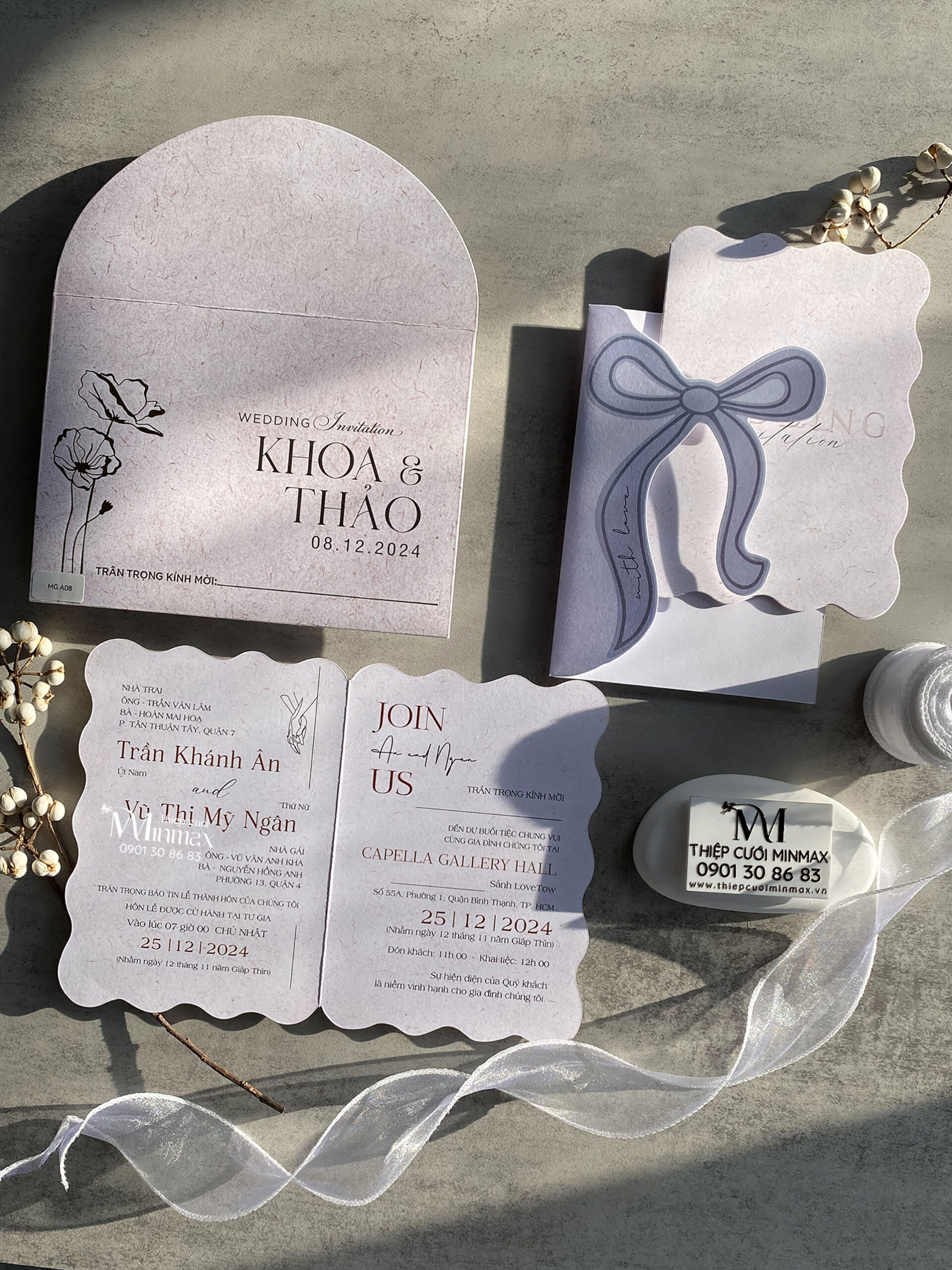 Thiệp cưới là lời mở đầu cho ngày trọng đại. Nó không chỉ thông báo lễ cưới mà còn thể hiện phong cách của cô dâu chú rể. Các cặp đôi hiện nay yêu thích sự tinh gọn và hiện đại. Thiệp cưới vì thế mang nét tối giản nhưng vẫn giữ được vẻ sang trọng. Màu sắc nhẹ nhàng và bố cục hài hòa tạo cảm giác thanh lịch. Mỗi tấm thiệp là một câu chuyện nhỏ, gửi gắm tình yêu và sự trân trọng đến khách mời.